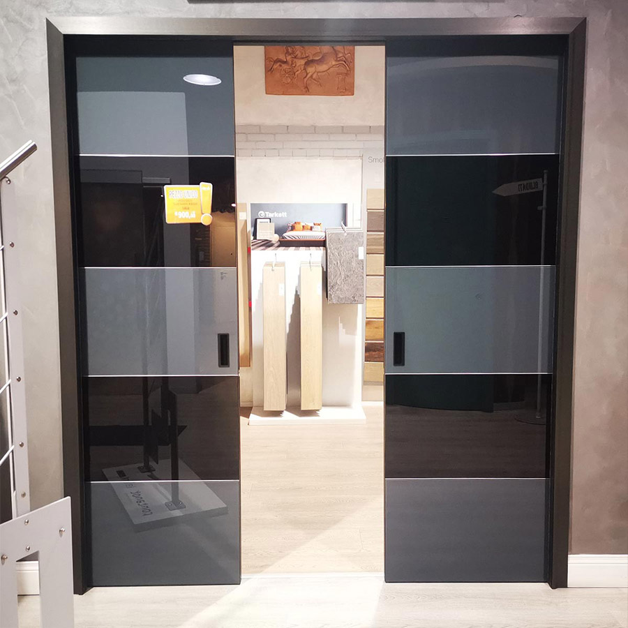 Anta scorrevole con rivestimento in cristallo interno ed esterno con colori come da foto, in vendita a 290,00 euro + IVA. Questo articolo è stato utilizzato esclusivamente come esposizione nel nostro Showroom di Roma e non è mai stata utilizzata per scopi pratici.