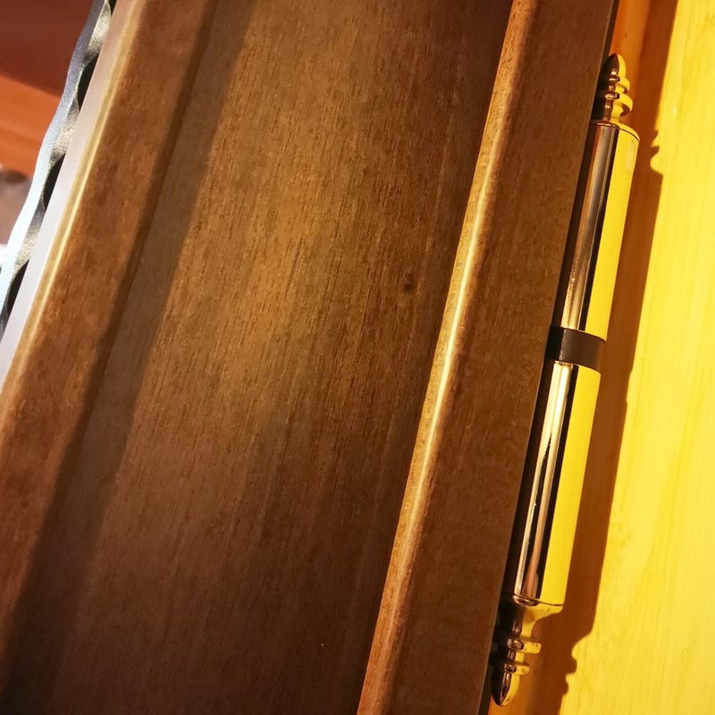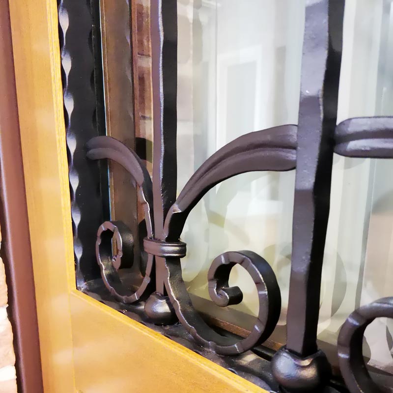 La porta è rivestita esternamente con pannello in Okume ed internamente con pannellatura in tinto noce. Nel centro è predisposto un vetro blindato con sovrapposta grata decorata.